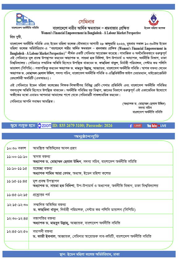 বাংলাদেশ অর্থনীতি সমিতি ও ইডেন মহিলা কলেজ যৌথ আয়োজনে সেমিনার ২৮ জানুয়ারি ২০২৬ তারিখ বুধবার সকাল ১০:৩০টায় ইডেন মহিলা কলেজ অডিটরিয়াম-এ ।